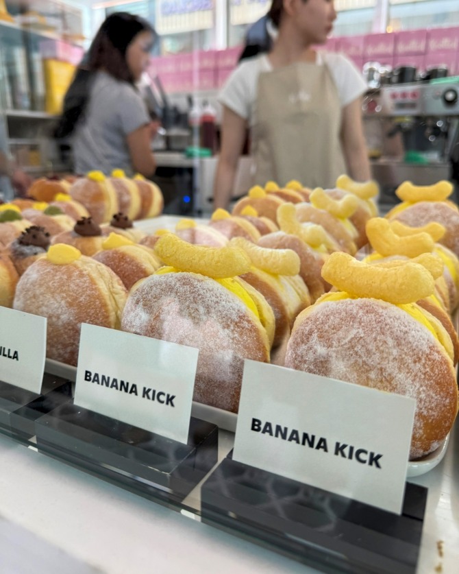 이미지 확대보기17일 농심에 따르면 디저트 카페 ‘노티드’와 손잡고 미국 LA 웨스트필드에 위치한 노티드 해외 1호점에서 시그니처 메뉴 ‘바나나킥 크림 도넛’을 선보였다. 바나나킥 고유의 부드럽고 달콤한 맛과 향을 담은 풍부한 크림에, 토핑으로 바나나킥을 얹은 것이 특징이다.
