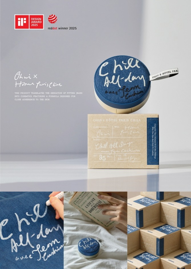 ‘오휘 얼티밋 핏 진 쿠션 X 호텔827’은 청바지처럼 일상에 자연스럽고 편안히 스며드는 핏(Fit)을 지향하는 진 쿠션 콘셉트에 프랑스 파리 감성 소품숍인 호텔 827의 무드를 적용해서 조화를 이뤘다. 감성적인 레터링과 호텔을 연상시키는 디자인 요소를 패키지에 더해 편안함과 세련된 스타일링을 동시에 구현했다. 특히 친환경 데님 소재와 업사이클링 포장재를 적극 활용해서 지속 가능한 가치를 제공한 점도 높은 평가를 받았다.