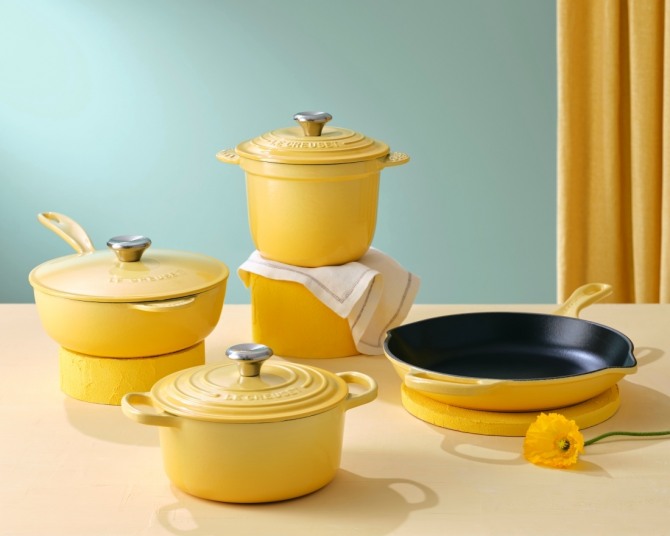 이미지 확대보기‘카모마일 컬렉션’은 햇살 아래 피어난 카모마일 꽃을 연상케 하는 옐로우 컬러를 담아냈다. 르크루제 대표 무쇠주물 제품인 △시그니처 원형냄비 △고메밥솥 △시그니처 스킬렛을 비롯해 △소스팬까지 총 4종으로 구성됐다.