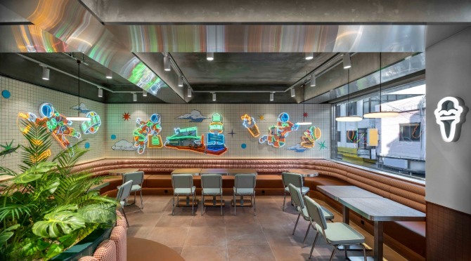 인테리어 차별화에도 신경 썼다. 가죽 거리로 유명한 성수동 지역 특색과 미국식 식당인 ‘다이너(Diner)’ 콘셉트를 결합해 네온 사인과 모자이크 타일, 가죽 소파 등으로 매장을 꾸몄다. 화성에 쉐이크쉑 다이너를 개점한 모습을 그린 ‘쉑 다이너 인 마스(Shack Diner in Mars)’도 특별한 분위기를 자아낸다.