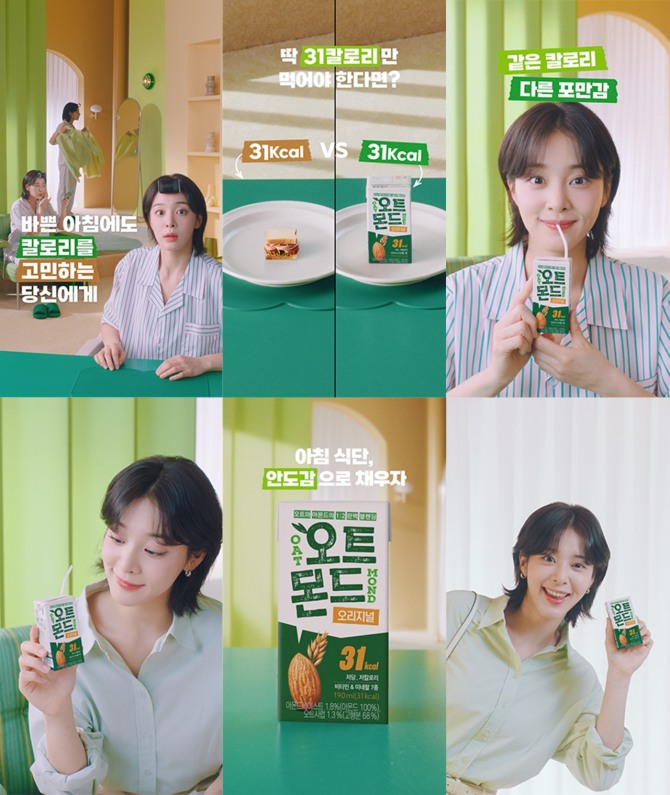 광고 영상 속 설인아는 “딱 31칼로리만 먹어야 한다면?”이라는 질문을 던진다. 샌드위치 한 입(31kcal), 초코 케이크 한 입(35kcal), 아몬드 세 알(28kcal)과 비교해 오트몬드는 같은 칼로리에서도 더 큰 포만감을 주는 음료라는 점을 강조했다.