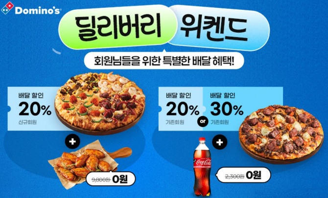 도미노피자의 ‘딜리버리 위켄드’는 자사채널(홈페이지, 모바일, 웹, 자사앱) 모든 회원을 대상으로 진행되며, 7월 1일부터 8월 3일까지 신규가입 회원 한정 배달 20% 할인 상시쿠폰 사용시 인기 사이드 메뉴인 웨스턴 핫윙을 무료로 제공한다. 이 외에도 기존 회원 중 Regular 등급은 배달 20% 할인, Premium, VIP, Royal 등급 회원이 배달 할인 30% 상시쿠폰을 사용하면 코카-콜라 1.25L를 제공한다.