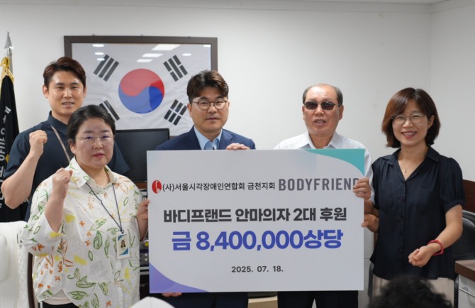 서울시각장애인연합회(금천지회)는 쉼터에서 쓰던 마사지기기들이 노후화와 A/S 불가로 사용과 관리에 어려움을 겪어왔다. 이러한 소식을 접한 바디프랜드는 쉼터의 환경 개선과 이용자들의 삶의 질 향상을 위해 마사지체어 기부를 결심, 설치를 진행하였다. 기부한 제품은 1인용 소파에 마사지 기능을 결합한 마사지소파 '아미고’와 체성분 측정이 가능한 홈 헬스케어 트레이너 '다빈치’로, 앞으로 쉼터를 이용하는 시각장애인들과 직원들의 건강 관리를 책임지게 된다.