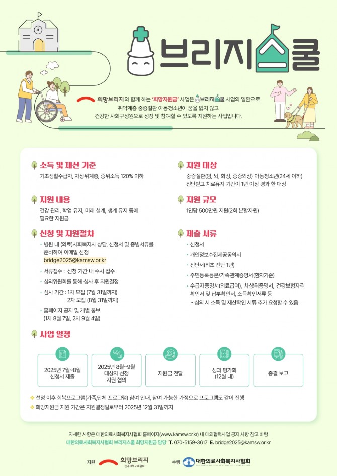 이미지 확대보기23일 희망브리지에 따르면 지난 4년간 ‘브리지스쿨’을 통해 중증외상, 화상, 소아암, 심장질환 등으로 장기 치료 중인 아이들에게 의료비와 생계비를 지원해 왔다.