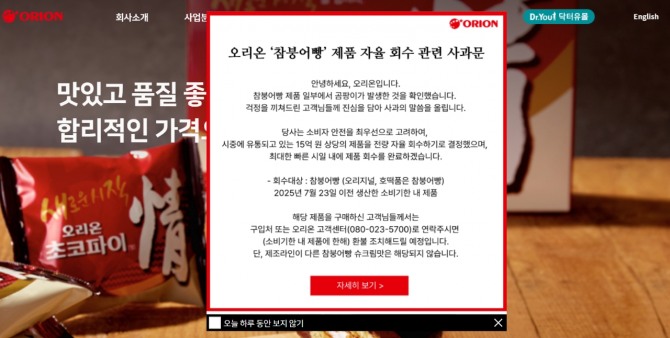 이미지 확대보기24일 오리온은 홈페이지에 사과문과 올리고 제품 회수를 안내했다.