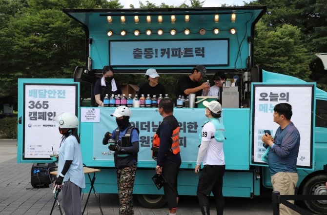 이미지 확대보기이번 이벤트는 지난달 30일 서울 송파구 올림픽공원에서 첫 번쨰로 열렸으며, 오는 5일에는 서울 중랑구 면목역 광장에서 두 번째 행사가 진행된다. 운영시간은 하루 중 가장 더운 오후 2~5시로 설정해 배달 중간에 잠시 라이더가 쉬어갈 수 있도록 했다.