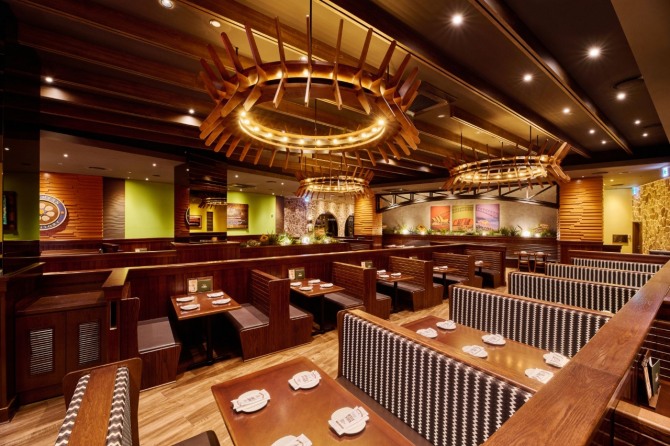 ‘아웃백 김포공항롯데몰점’은 누구나 편안하게 이용할 수 있는 도심형 다이닝 공간으로, 아웃백이 추구하는 ‘일상 속 아웃백’ 철학을 매장 전반에 반영했다. 오픈 도어 구조를 적용해 개방감을 높였으며, 메인 입구에는 아웃백의 시그니처인 그린 캐노피를 설치해 직관적인 브랜드 경험을 제공한다. 또한 천장에는 호주의 사막과 대자연에서 착안한 부메랑형 구조물을 배치했고, 홀 중앙에는 하버브릿지 콘셉트를 적용한 반부스 형태의 테이블을 마련하여 공간의 몰입감을 강화했다.