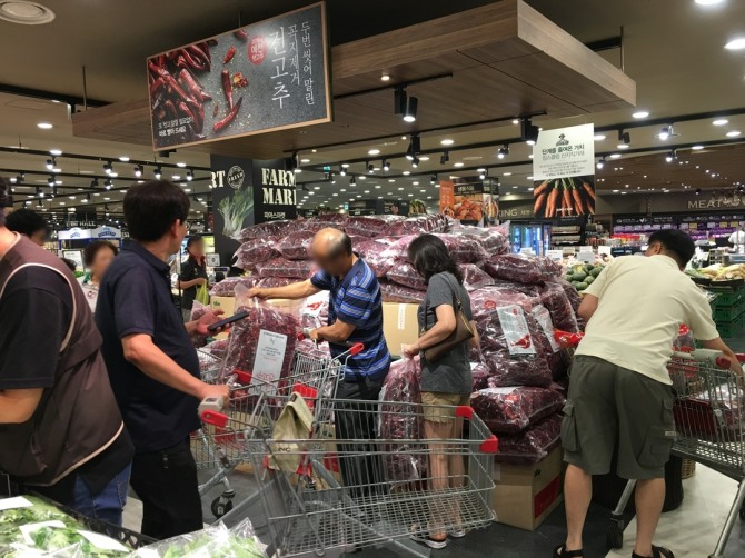 이미지 확대보기이는 햇건고추가 가장 품질 좋은 시기인 7~8월 수확철을 맞아 주부들이 김장 재료와 양념으로 활용하기 위해 미리 구매한 영향이 크다. 통상 김장 재료는 추석 이후 본격 김장철에 가까워질수록 가격이 오르는데, 지금이 품질과 가격 모두에서 유리하기 때문이다.