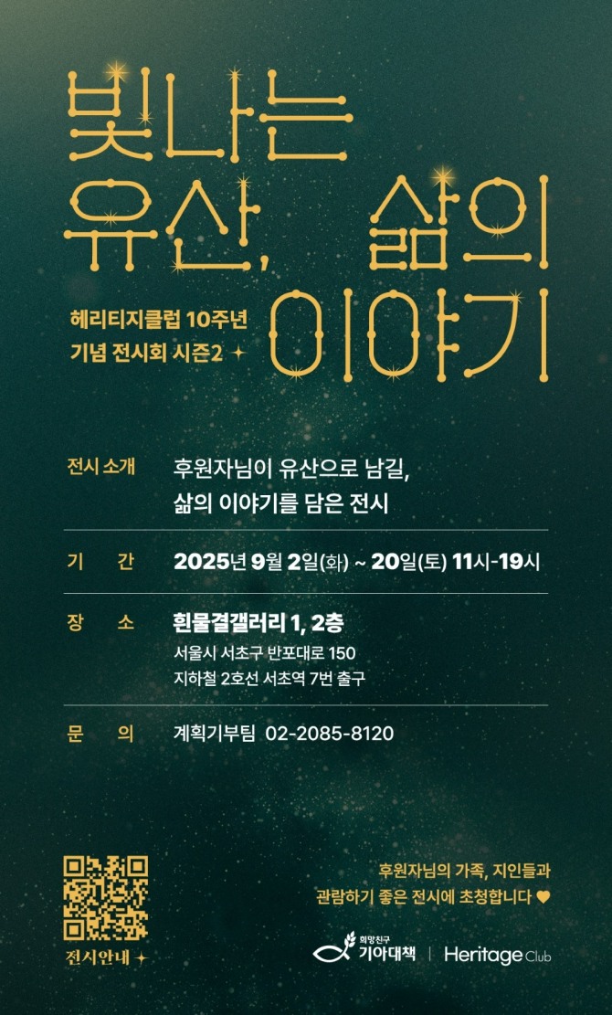 올해 두 번째 시즌을 맞은 헤리티지클럽 10주년 기념 전시회는 ‘유산은 삶의 방향과 가치를 다음 세대에 전하는 선택입니다’는 슬로건 아래, 후원자 개개인이 남기고자 한 삶의 신념과 나눔의 이야기를 기억하고 기념하기 위해 마련됐다.