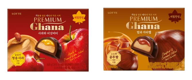 이미지 확대보기이번 신제품은 가을 제철 과일인 사과와 밤을 활용한 쉘 형태의 초콜릿 △'프리미엄 가나 사과와 피넛버터' △'프리미엄 가나 밤과 카라멜' 2종이다.