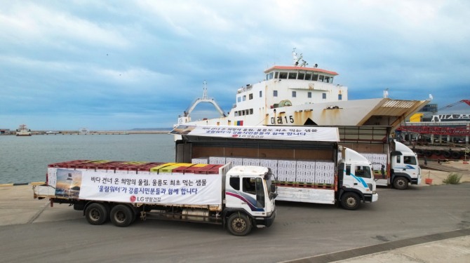 이미지 확대보기LG생활건강은 지난 12일 강릉시에 울림워터 1차 지원분(13만 1520병)을 전달했다. 울림워터는 울릉도 최초의 먹는 샘물로, 이번에 지원하는 물량은 이달 초 울릉도 현지 공장에서 신속히 생산해 배와 육로를 거쳐 강릉 아이스아레나에 배송됐다. LG생활건강은 오는 22일 울림워터 2차 지원분(16만 8480병)을 추가 기부할 예정이다.