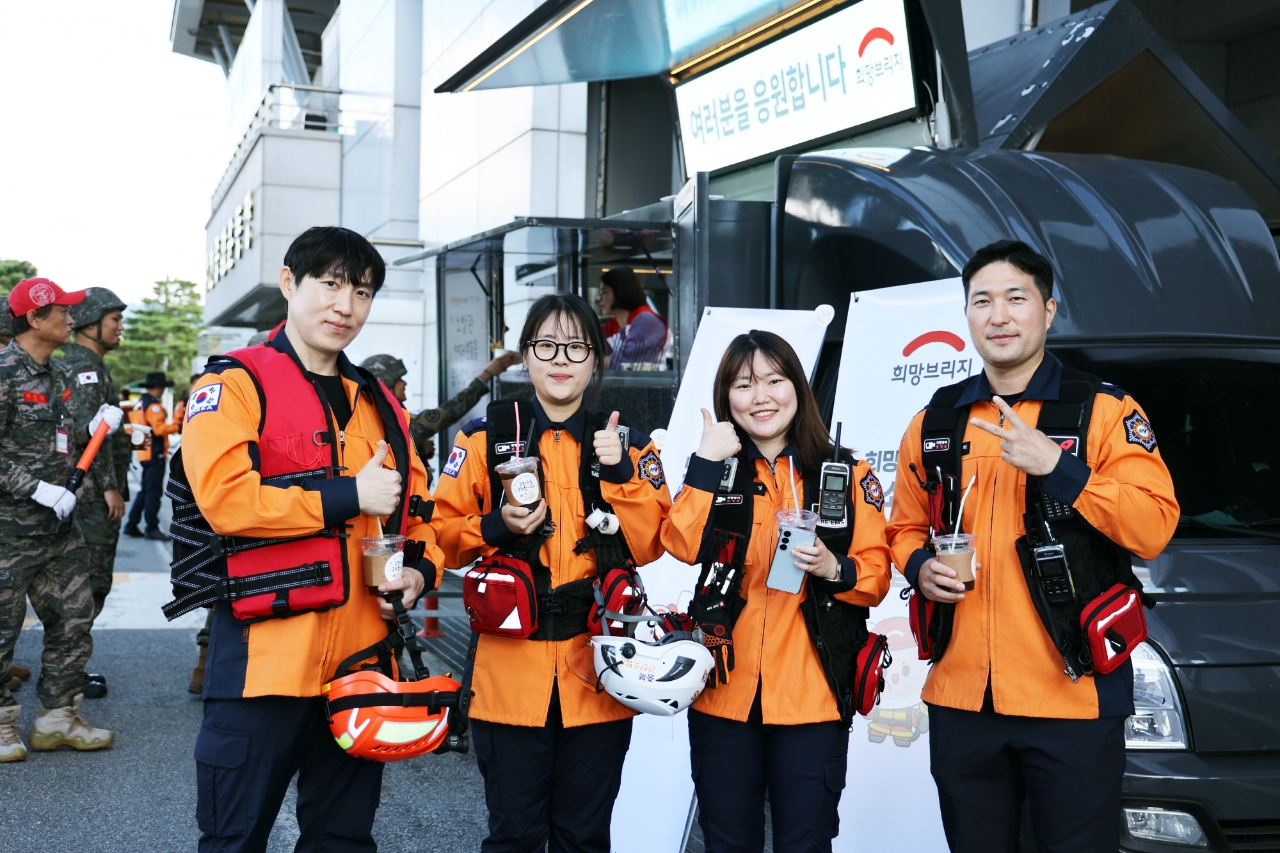 희망브리지는 재난 현장의 중심에서 국민의 생명을 지키는 소방관들의 체력 회복과 훈련 집중도를 높이기 위해 간식차를 보내 커피, 음료, 어묵 등 간식을 전달하며 ‘국민의 영웅’인 소방관들을 응원했다.