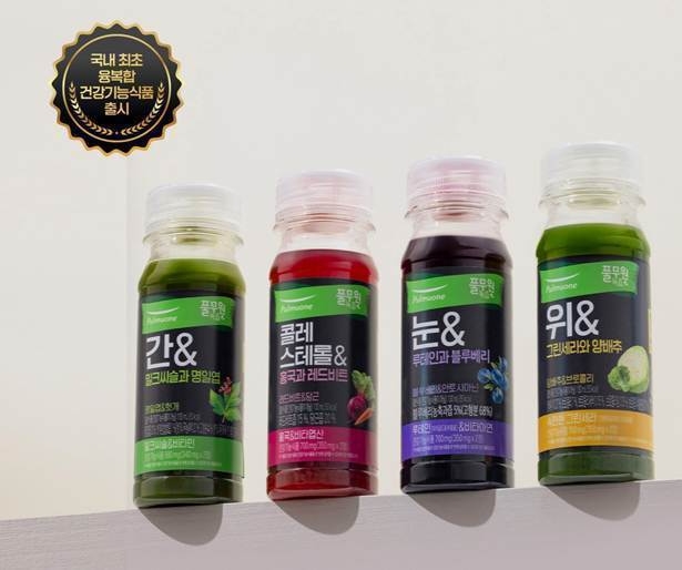 풀무원녹즙이 선보인 융복합 건강기능식품은 건강기능식품(정제, 캡슐)과 액상(건강기능식품이 아닌 일반식품)을 한 번에 섭취할 수 있도록 결합한 일체형 제품이다. 제품 병 부분에는 과채주스와 혼합음료 형태의 일반식품이 들어 있으며, 뚜껑에는 정제 형태의 건강기능식품 1회분을 담아 설계했다.