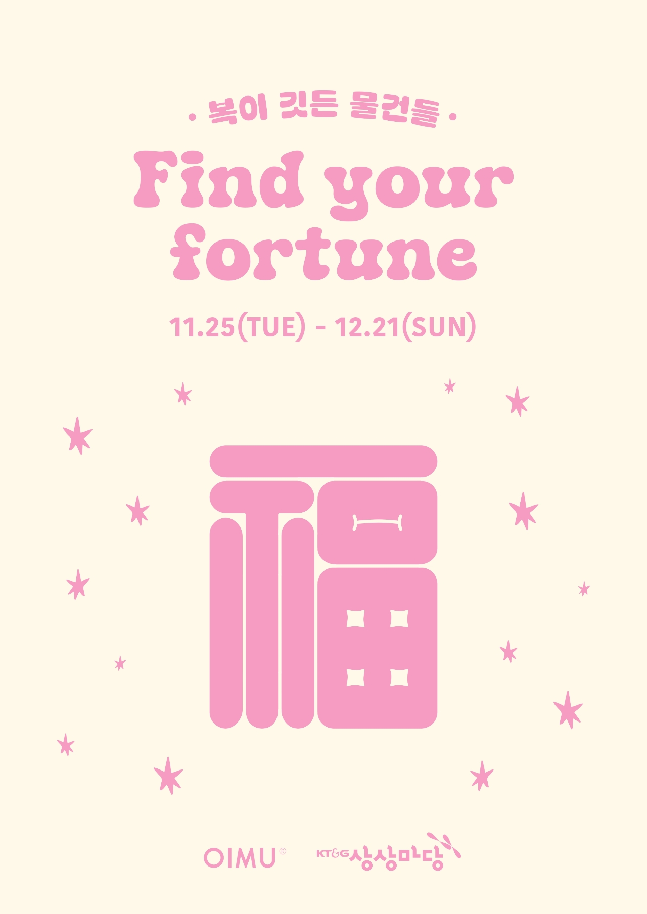 이미지 확대보기KT&G 상상마당은 새해 행운을 기원하는 콘셉트의 ‘복(福)이 깃든 물건들-Find your fortune’ 팝업스토어를 오는 21일까지 진행한다고 3일 밝혔다. 팝업스토어 포스터 이미지. 사진=KT&G 상상마당 KT&G 상상마당은 새해 행운을 기원하는 콘셉트의 ‘복(福)이 깃든 물건들-Find your fortune’ 팝업스토어를 오는 21일까지 진행한다고 3일 밝혔다.