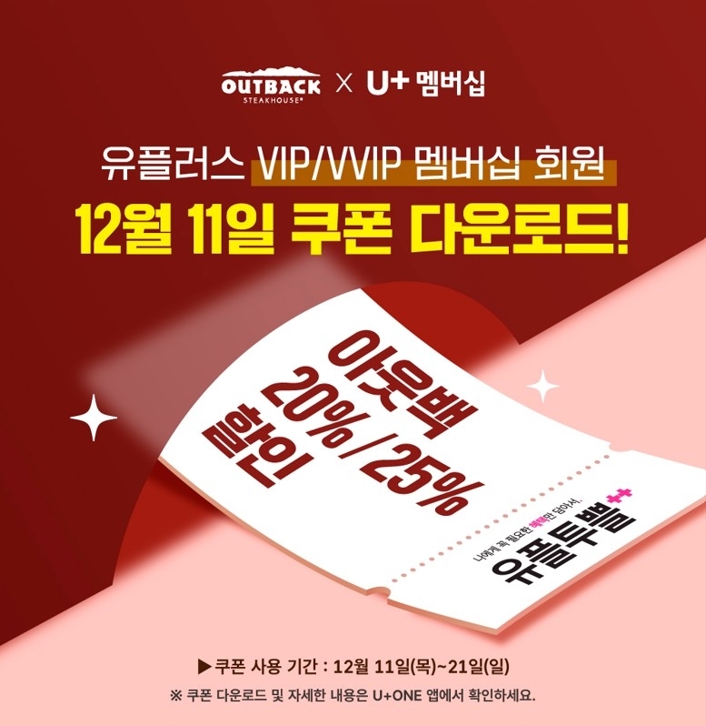 이미지 확대보기이번 행사는 각종 모임이 잦은 12월, 아웃백을 찾는 고객들이 더욱 가볍고 즐거운 마음으로 식사를 즐길 수 있도록 기획됐다. LG유플러스 멤버십 VVIP 및 VIP 등급 고객이라면 누구나 참여 가능하며, 등급에 따라 결제 금액의 20% 또는 25% 할인 혜택을 받을 수 있다.