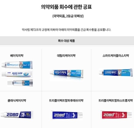 회수 대상은 △2080 베이직치약 △2080 데일리케어치약 △2080 스마트케어플러스치약 △2080 클래식케어치약 △2080 트리플이펙트알파후레쉬치약 △2080 트리플이펙트알파스트롱치약 등이다.