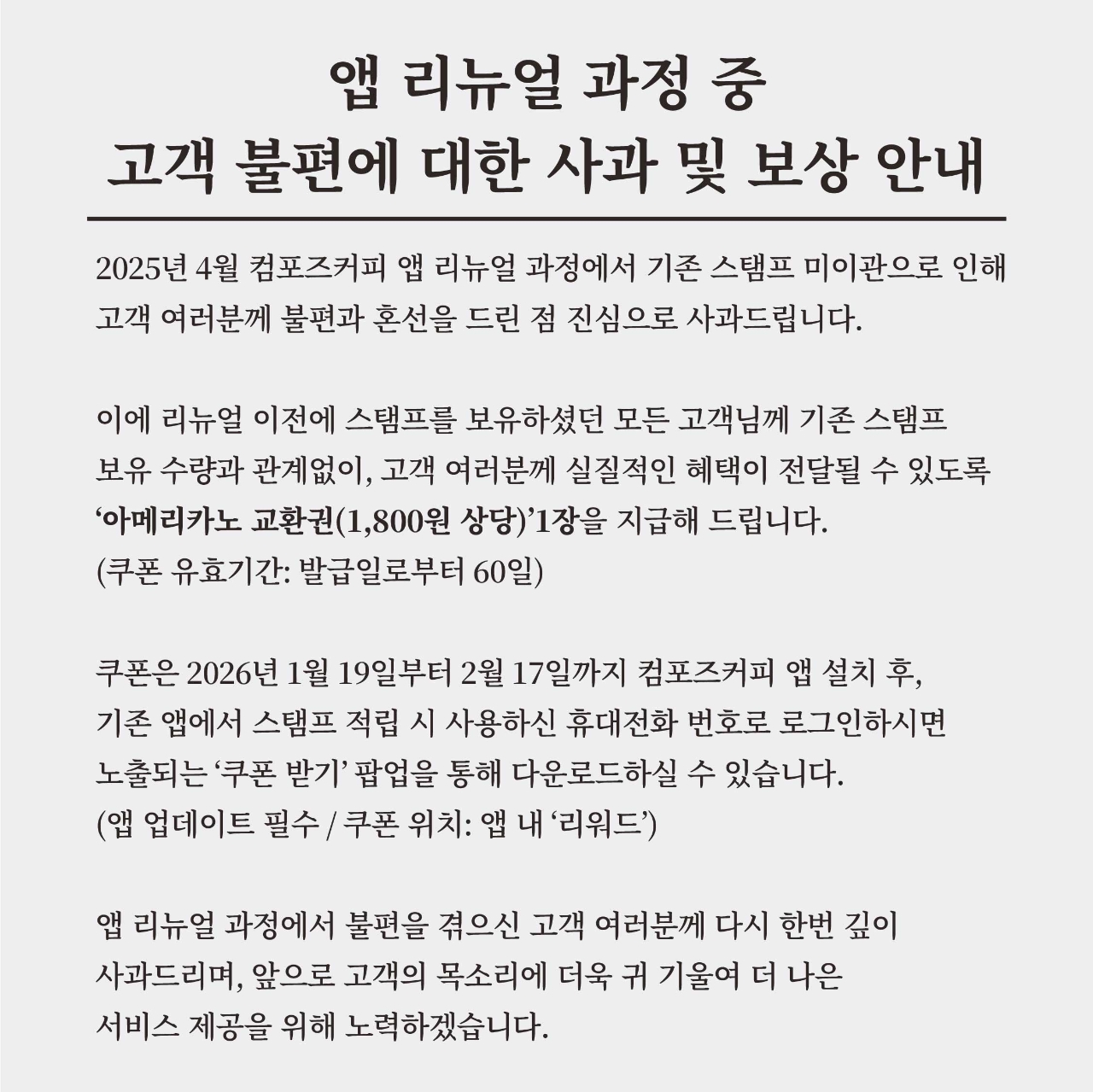 이에 컴포즈커피는 앱 리뉴얼 이전 스탬프를 보유했던 모든 고객을 대상으로, 기존 스탬프 보유 수량과 관계없이 ‘아메리카노 교환권(1,800원 상당)’ 1장을 지급하기로 결정했다. 컴포즈커피는 고객에게 실질적인 혜택이 전달될 수 있는 보상 방안을 마련하는 과정에서 시스템 점검과 운영 검토가 필요했으며, 그로 인해 보상 안내까지 다소 시간이 소요된 점에 대해서도 유감의 뜻을 밝혔다.