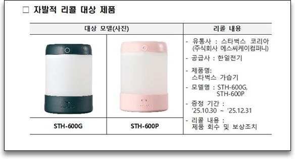 산업통상부 국가기술표준원이 오는 2일부터 스타벅스 코리아가 작년 10∼12월 소비자에게 증정한 가습기 2개 모델(STH-600G·STH-600P) 전량에 대해 자발적 리콜을 실시한다. 리콜 대상 스타벅스 가습기 모델. 사진=산업통상부 국가기술표준원