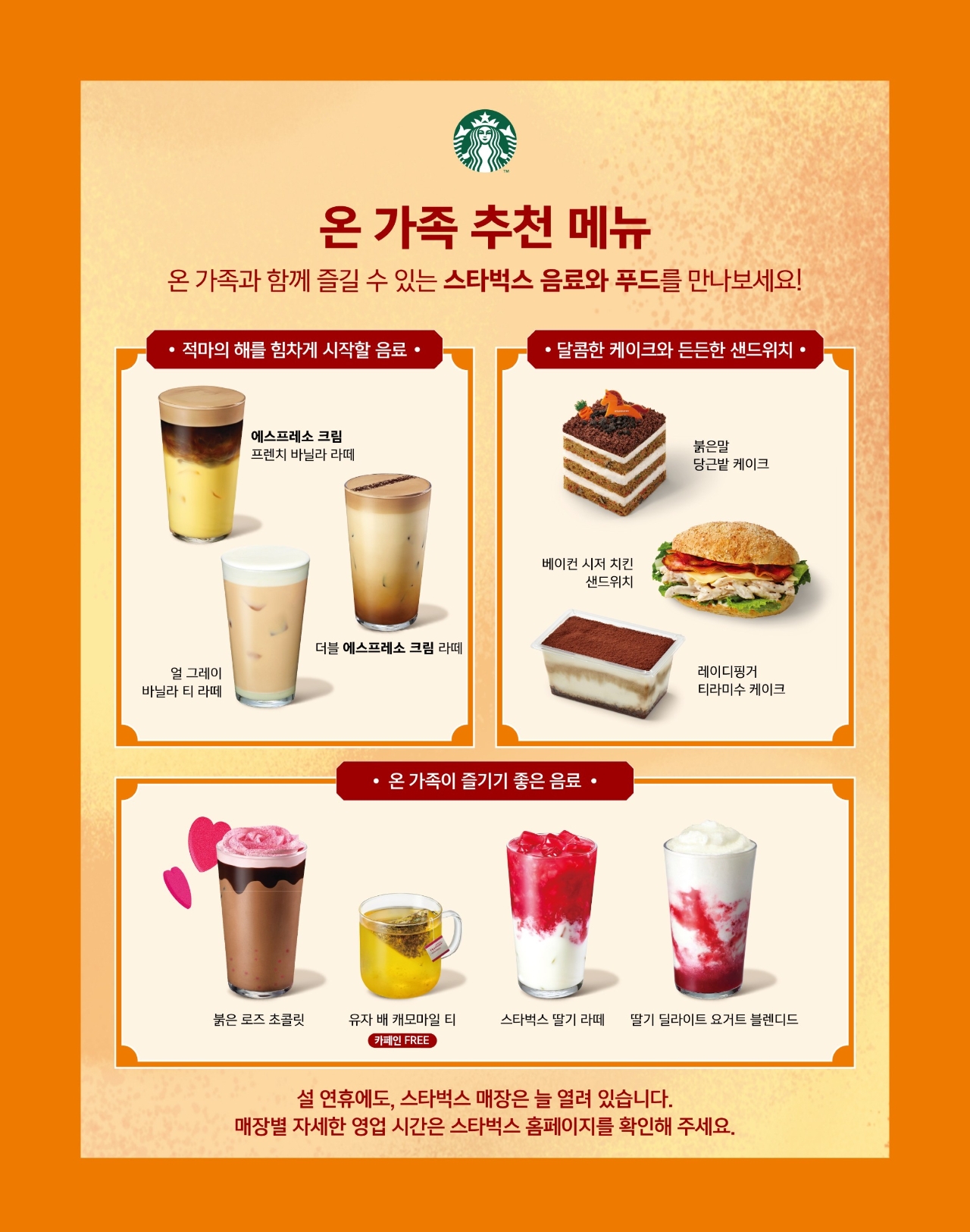 스타벅스 관계자는 “설 연휴 기간 동안 스타벅스 매장을 방문한 고객분들에게 온 가족과 함께 즐길 수 있는 메뉴를 구성해 소개한다”라며 “설 연휴에도 스타벅스 매장은 고객분들과 함께하기 위해 늘 열려 있으며 매장별 자세한 영업시간은 스타벅스 앱과 홈페이지에서 확인할 수 있다”라고 말했다.