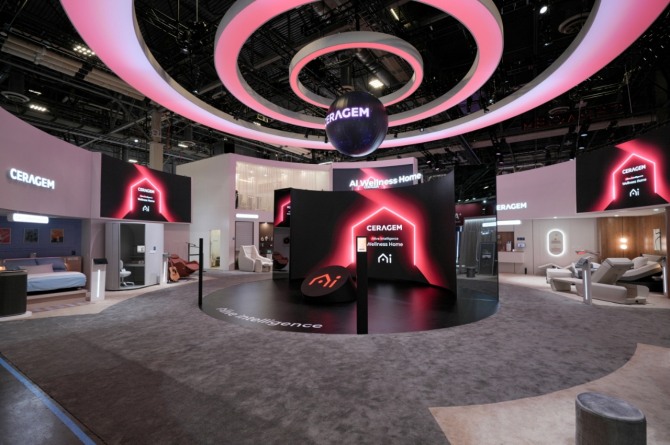 전시관 중앙에는 지름 약 15m 규모의 대형 조명 구조물과 원형 LED 디스플레이를 배치해 공간 전체의 중심이 되는 상징적 연출을 구현했으며, 헬스케어 제품과 연동된 세라젬 AI 안내 콘텐츠를 캐릭터 애니메이션 형태로 제공해 관람객이 제품 기능과 활용 방식을 보다 쉽게 이해할 수 있도록 했다. 또한 ‘세라체크(CERACHECK)’ 존을 통해 측정부터 분석, 맞춤형 헬스케어까지 연결되는 데이터 기반 헬스케어 플랫폼의 비전도 함께 선보였다.