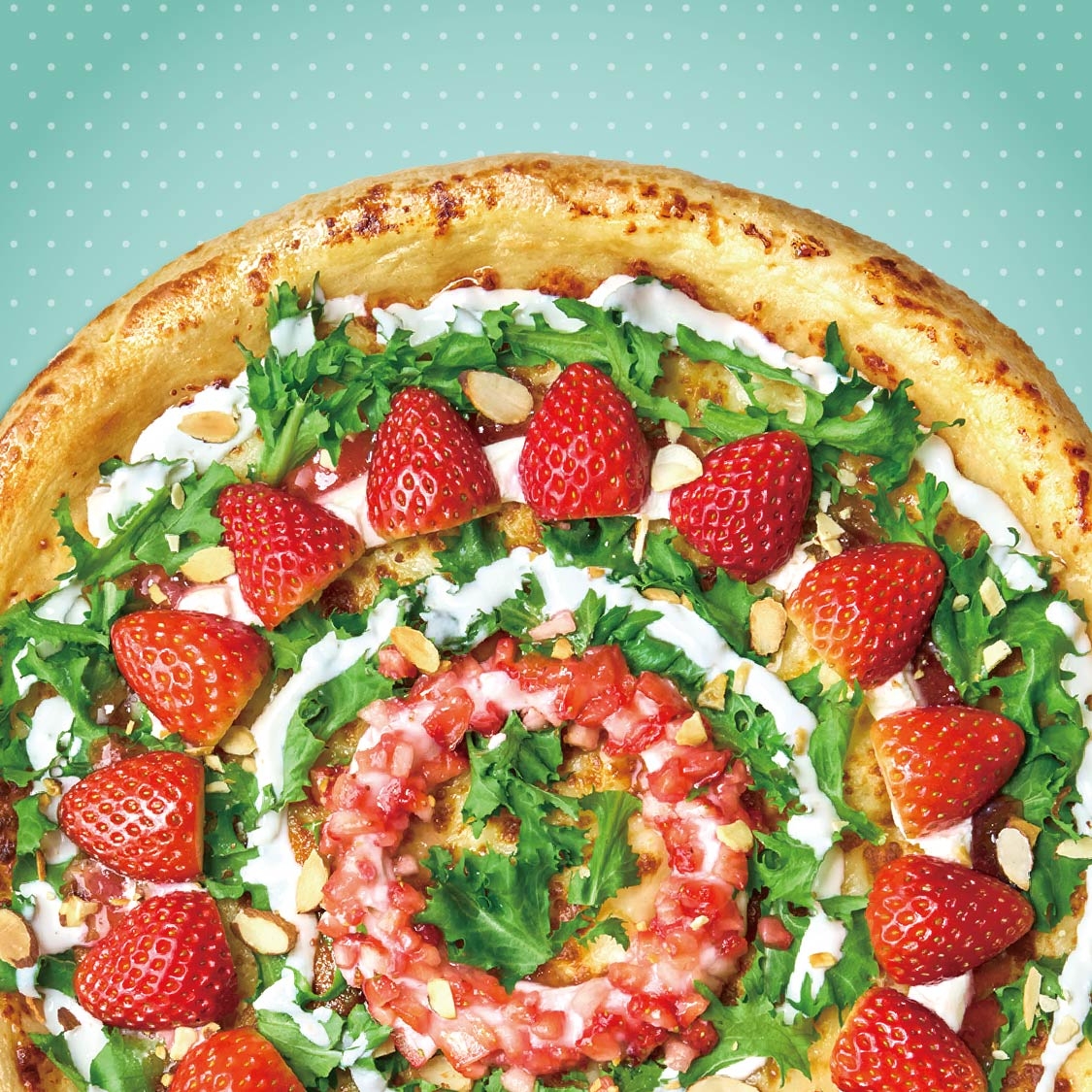 리코타 치즈 소스와 치커리를 더해 산뜻함을 살렸으며, 점도가 낮은 딸기 리플잼을 활용해 과육 식감을 강조했다. 여기에 고소한 아몬드를 더해 바삭한 식감을 더하면서 달콤함과 부드러움, 상큼함이 자연스럽게 어우러지는 맛을 구현했다. 부담스럽지 않은 당도로 가볍게 즐길 수 있는 ‘샐러드 피자' 콘셉트로 기획해, 트렌드에 민감한 고객층의 취향을 반영한 것이 특징이다.