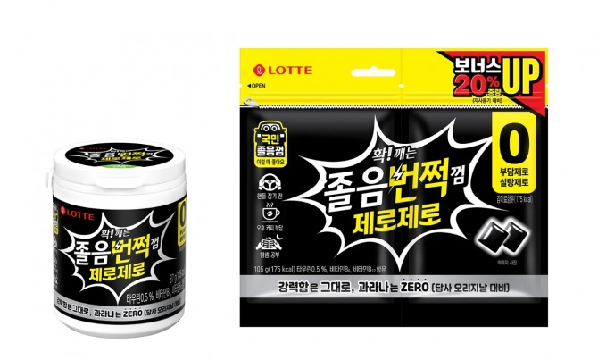 이번에 선보인 ‘졸음번쩍껌 제로제로’는 카페인과 설탕이 모두 들어있지 않은 제품이다. 강한 멘톨향이 주는 시원함과 씹는 행위 자체로도 졸음을 쫓을 수 있지만, 카페인이 함유되지 않아 수면 리듬에 영향을 주지 않는다. 무설탕 제품이어서 부담도 적다는 점이 특징이다.