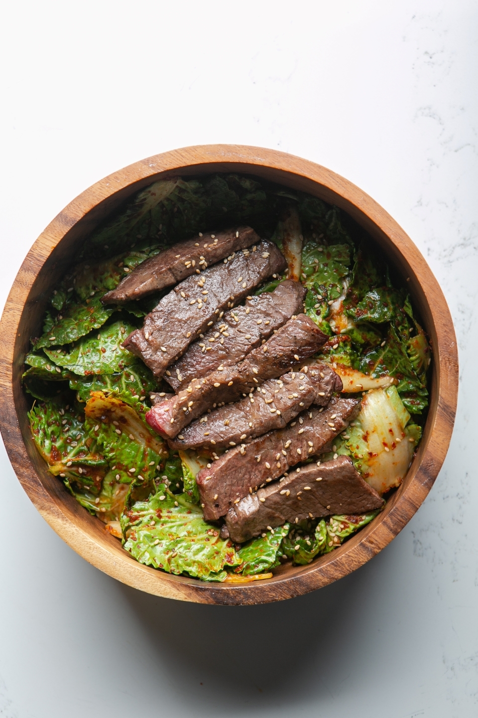 손질한 봄동을 양념장에 가볍게 버무린 뒤, 노릇하게 구운 한우 치마살을 올리면 ‘한우 봄동 무침’이 완성된다. 봄동의 산뜻함과 한우 치마살의 고소한 육즙이 어우러져 입맛을 돋우는 봄철 별미로 손색이 없다.
