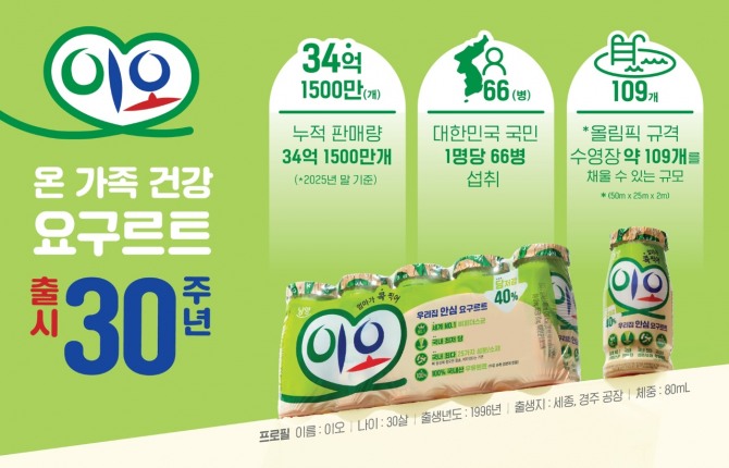 남양유업은 마시는 요구르트 ‘이오’ 출시 30주년을 맞았다고 31일 밝혔다. 누적 판매량은 지난해 말 기준 34억 1500만개에 달하며, 총 2억 7320만 리터가 판매된 것으로 집계됐다. 이는 올림픽 규격 수영장 약 109개를 채울 수 있는 물량이다.