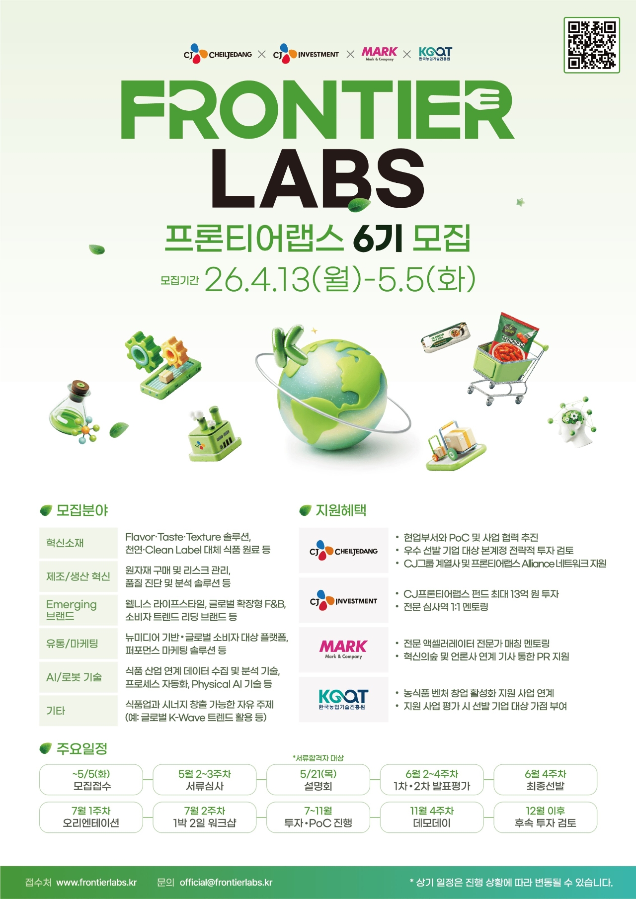 이희준 CJ제일제당 Venture Investment 팀장은 “프론티어랩스는 전문 투자∙육성 기관과 함께 유망 스타트업을 선제적으로 발굴하며 한국 푸드테크 생태계를 활성화하는 핵심 플랫폼으로 자리잡았다”며, “앞으로도 체계적인 육성 프로그램을 통해 차별화된 아이디어를 가진 혁신 스타트업들이 글로벌 경쟁력을 갖추고 미래 식품 산업을 이끌어갈 수 있도록 전폭 지원하겠다”고 밝혔다.
