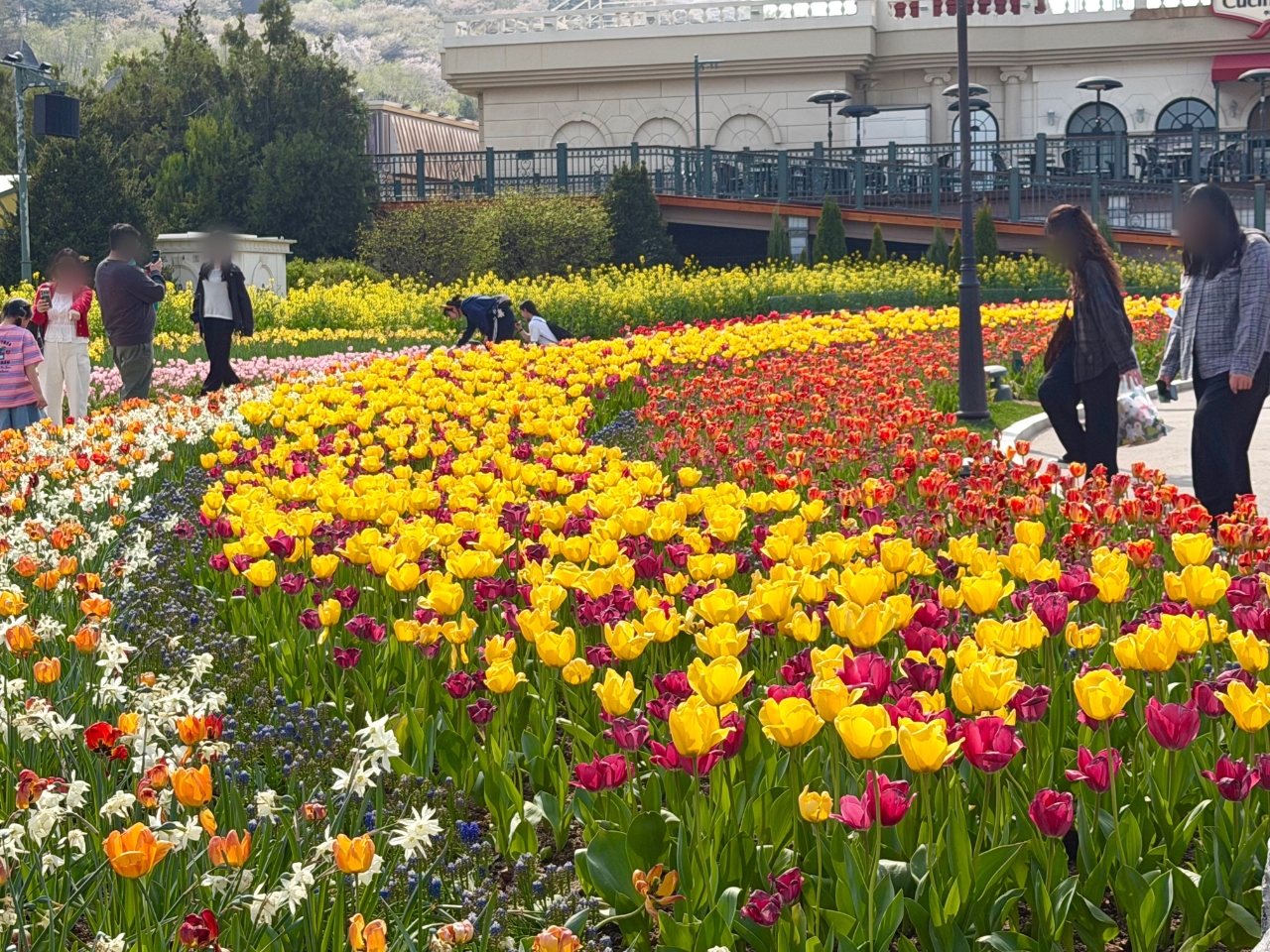 판다월드를 지나 포시즌스가든으로 향하자 정원 전면이 봄꽃으로 채워져 있었다. 튤립과 수선화, 무스카리 등 다양한 꽃들이 층층이 이어졌고, 화단 사이를 따라 걷는 관람객들의 발걸음이 끊이지 않았다. 만발한 튤립을 배경으로 사진을 찍기 위해 멈춰 서는 사람들이 이어졌고, 일부 구간에서는 잠시 정체가 생기기도 했다. 곳곳에서는 벤치에 앉아 쉬거나 잔디에 머무는 모습도 눈에 띄었다. 대형 LED 스크린 속 영상과 실제 화단이 이어지는 ‘인피니티 튤립 가든’도 관람객들의 눈길을 끌었다.