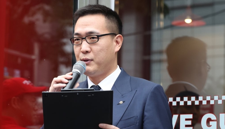 지난 파이브가이즈 개막 행사에 김동선 한화갤러리아 전략본부장이 인사말을 하고 있다. 사진=연합뉴스