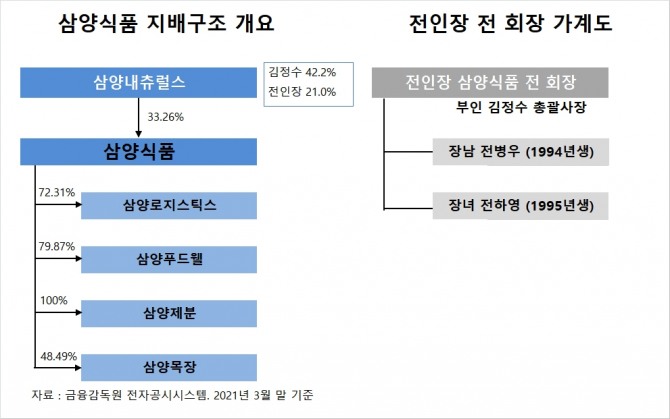 삼양식품은 김정수 총괄사장이 지분 4.33%(32만5850주), 전인장 전 회장이 지분 3.13%(23만6000주), 전 전 회장의 장남 전병우 이사가 지분 0.59%(4만4750주), 전 전 회장의 장녀 전하영 씨가 지분 0.05%(4000주)를 갖고 있습니다. 엠디유니콘제일차는 지분 8.76%(65만9890주)를 갖고 있습니다.