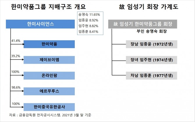 송 회장이 장남인 임종윤 한미사이언스 대표를 제치고 한미약품그룹의 회장으로 취임하게 된 데는 자녀간 임 회장의 상속지분을 둘러싼 분쟁을 사전에 막기 위한 조치라는 얘기도 있습니다.