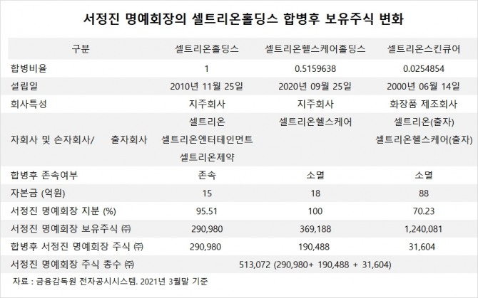 셀트리온홀딩스·셀트리온헬스케어홀딩스·셀트리온스킨큐어가 합병을 완료하면 서 명예회장의 주식은 셀트리온홀딩스 단일 주식으로 51만3072주에 달하게 됩니다.