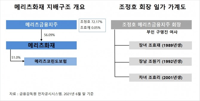 메리츠화재의 지주회사인 메리츠금융지주는 조정호 회장이 최대주주로 지분 72.17%(9671만4384주)를 보유하고 있습니다. 조 회장의 장녀 조효재 씨가 지분 0.05%(6만8523주), 김용범 부회장이 지분 0.03%(4만주)를 갖고 있습니다.