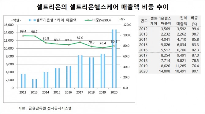 셀트리온의 셀트리온헬스케어에 대한 매출액 비중은 2018년 78.5%, 2019년 76.4%, 2020년에는 80.1%를 기록한 것으로 집계됐습니다.