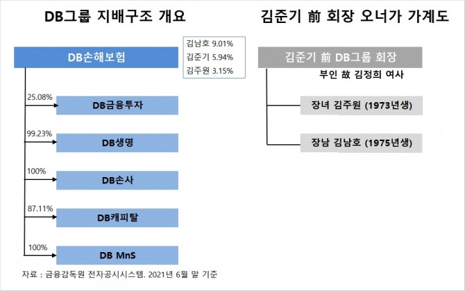 DB그룹 금융계열사의 지배구조는 김남호 회장, 김준기 전 회장, 김준기 전 회장의 장녀 김주원 씨가 대주주로 있는 DB손해보험에서 시작된다고 할 수 있습니다.
