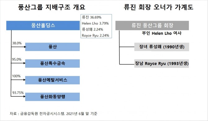 류진 회장의 부인 Helen Lho는 지분 3.79%(39만4308주), 류 회장의 자녀인 류성왜 씨와 Royce Ryu가 각각 2.24%(23만3100주)를 소유하고 있습니다. 류진 회장의 형인 류청 씨는 풍산홀딩스 지분을 갖고 있지 않은 것으로 나타났습니다.