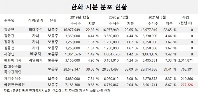 이미지 확대보기에이치솔루션을 흡수 합병한 한화에너지는 김동관 사장이 지분 50%(677만1334주), 김동원 한화생명 부사장과 김동선 상무가 각각 25%(338만5667주)를 보유하고 있습니다.
