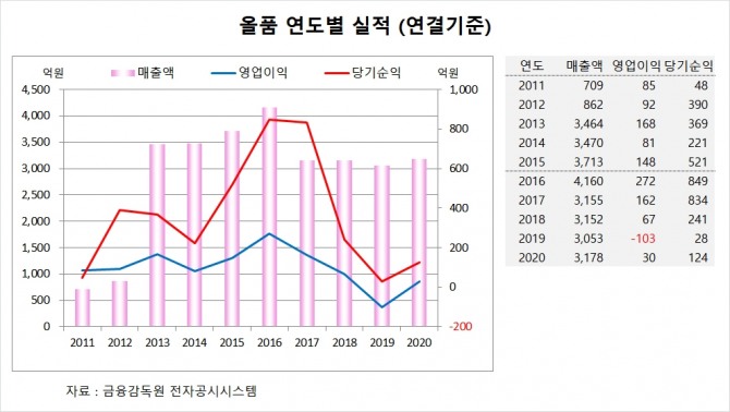 올품은 지난 2016~2017년 시기에 최고의 성수기를 맞았습니다. 올품은 2017년 연결기준 매출액 3155억원, 영업이익 162억원, 당기순이익 834억원을 기록했습니다.