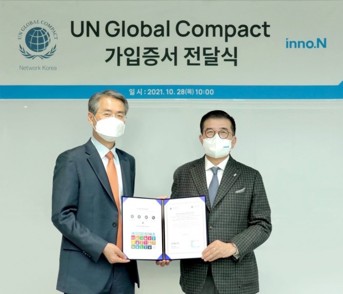 HK inno.N은 28일 서울 중구 본사에서 UNGC 가입증서 전달식을 가졌다. 전달식에는 강석희 HK inno.N 대표와 권춘택 UNGC 한국협회 사무총장 등 양측 주요 관계자들이 참석했다.