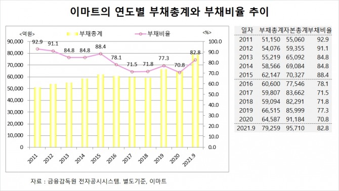 이마트의 부채총계는 지난 2011년말 5조1150억원, 부채비율이 92.9%에 달했으나 올해 9월말 부채종계가 7조9259억원으로 늘었으나 부채비율은 82.8%로 10.1%포인트 하락했습니다. 통상 업계에서는 부채비율이 200% 이내일 때 안정적으로 평가하고 있습니다.