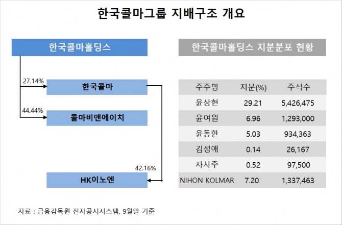 윤동한 회장은 지분 5.03%(93만4363주)를 갖고 있습니다. 윤 회장의 부인인 김성애 씨는 지분 0.14%(2만6167주)를 소유하고 있습니다. 일본 콜마(NIHON KOLMAR)는 지분 7.20%(133만7463주)를 갖고 있습니다.