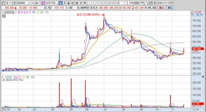 남영유업의 이날 주가는 전일보다 8.99%(4만원) 급등한 48만5000원에 장을 마감했습니다. 그러나 장중에는 남영유업의 대유에이텍그룹과의 협약에 대한 내용이 공시되지 않았습니다.