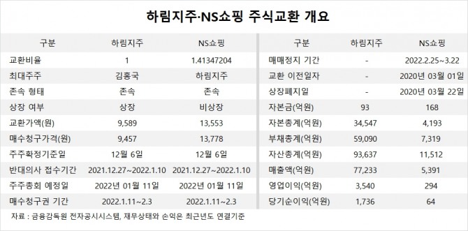 교환가액은 최근 1개월간 가중산술평균 주가, 1주일간 가중산술평균 주가, 11월 18일의 종가를 단순 평균해 하림지주가 9589원, NS쇼핑이 1만3553원으로 결정됐습니다.