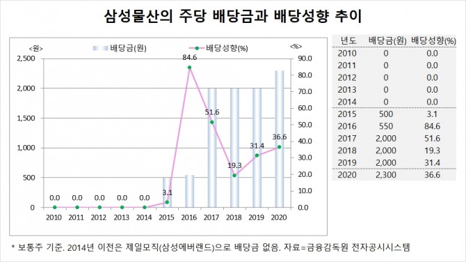 삼성물산은 2015년 500원, 2016년 550원, 2017년~2019년 2000원, 그리고 2020년에는 2300원의 배당금을 줬습니다.