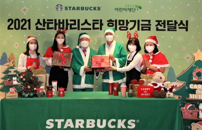 이미지 확대보기15일 관련 업계에 따르면 ㈜스타벅스커피 코리아(이하 스타벅스)는 이날 서울시 중구 퇴계로 스타벅스 지원센터에서 연말 소외계층 어린이와 청년 후원을 위한 ‘2021 산타 바리스타 희망기금 전달식’을 갖고, 총 9억6000여만원의 희망기금을 초록우산 어린이재단에 전달했다.