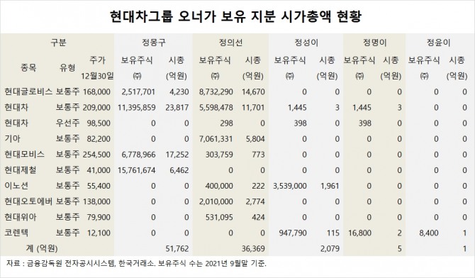 정몽구 명예회장이 보유하고 있는 상장 주식의 시가총액은 지난해 12월 30일을 기준으로 5조1762억원, 정의선 회장이 3조6369억원, 정성이 고문이 2079억원, 정명이 사장이 5억원, 정윤이 사장이 1억원에 이르고 있습니다.