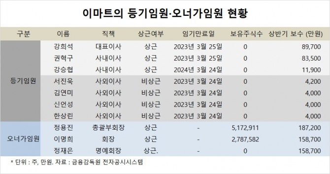 이마트가 지불하는 신세계 오너가에 대한 높은 보수 논란…올 상반기 정용진 부회장 보수 18억7200만원, 강희석 대표보다 2배 이상 많아
