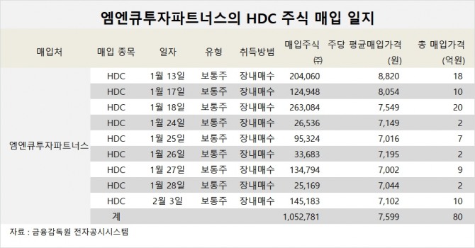 엠엔큐투자파트너스는 지난 1월 13일부터 2월 3일까지 9차례에 걸쳐 HDC 주식 105만2781주를 매입했습니다. 총 매입단가는 80억원 규모입니다. 평균매입단가는 약 7599원 수준입니다.